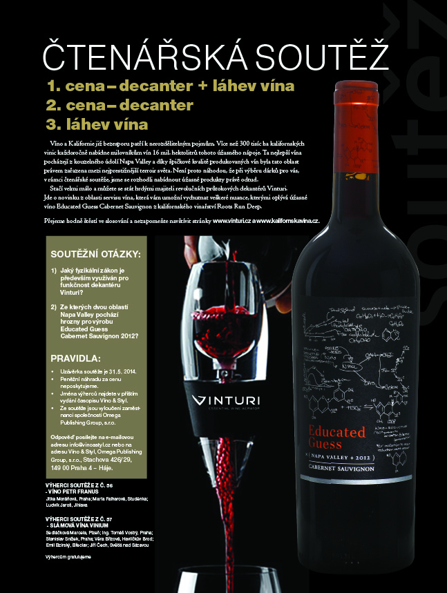 Potřebné informace najdete na stránkách www.vinturi.cz a www.kalifornskavina.cz. Správné odpovědi můžete posílat na e-mail: info@vinoastyl.cz nebo na adresu Víno a Styl, Omega Publishing Group, s.r.o., Stachova 426/29, 149 00 Praha 4 – Háje. Do předmětu nebo na obálku prosím uveďte heslo „Dekanter“.