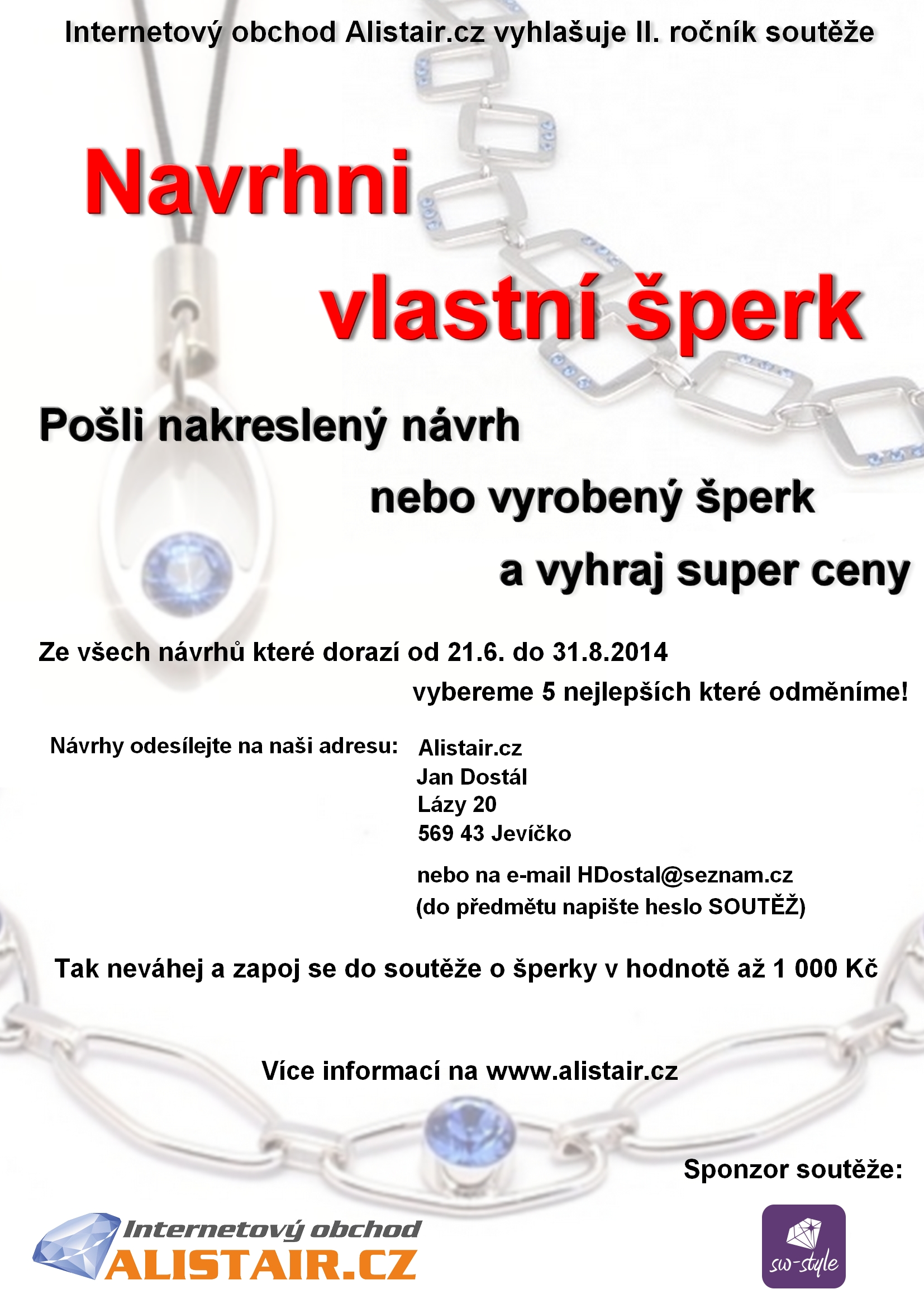 Cílem soutěže je navrhnout (nakresil na papír, na počítači, vyfotit…) nebo vyrobit vlastní šperk. Je pouze na Vás jakou zvolíte techniku, jaký materiál a jakým způsobem šperk vytvoříte.
