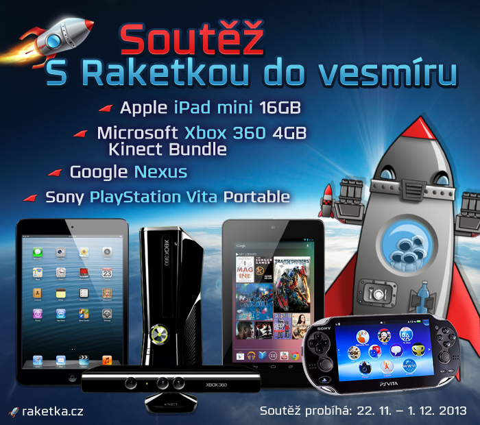 V těchto zimních dnech nás Raketka opět zahřeje! Slibovaná soutěž je již v plném proudu, tak se připojte i Vy! Tentokrát budete mít jedinečnou možnost podívat se do vesmíru, vlastnoručně postavenou raketou! K jejímu postavení však budete potřebovat hvězdičky, které získáte plněním úkolů. Za hvězdičky následně pořizujete vybavení pro raketku. Postavte si funkční raketku a odhalujete tajemství vzdálených planet a celého vesmíru! Soutěž se koná od 22.11.2013 (pátek) do 1.12.2013 (neděle) a na jejím konci čeká mnoho hodnotných cen!