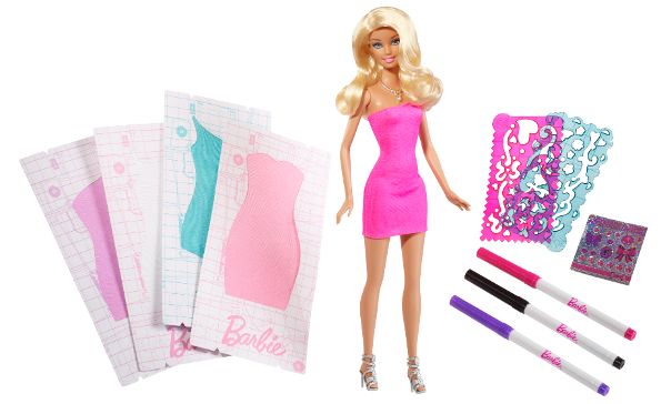Pro všechny malé návrhářky je určena doplňková sada Barbie Design Studio. Vytvořit stylové a módní šatičky pro panenku Barbie mohou kreativní holčičky pomocí plastové šablonky, fixky, zdobítek a třpytivých samolepek. K vytvoření módních kreací poslouží troje šatičky, které jsou součástí balení.