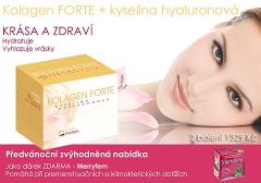 | Ceny: | tablety Kolagen FORTE + kyselina hyaluronová = kúru na 2 měsíce pro váš mladistvý vzhled. Hodnota každé této kúry je 729 Kč. Kúra na dva měsíce obsahuje: 120 tablet Kolagenu Forte, 1 tableta obsahuje 1 000mg účinné látky + 60 tablet kyseliny hyaluronové, 1 tableta obsahuje 50mg účinné látky. |
