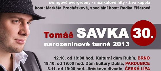Zodpovězte správně soutěžní otázku a 3 z vás, kdo splní pravidla soutěže, získají 2 vstupenky v hodnotě 700 Kč na narozeninové turné Tomáše Savky – město dle vlastního výběru: 12.10. Brno; 19.10. Pardubice nebo 8.11. Česká Lípa.
