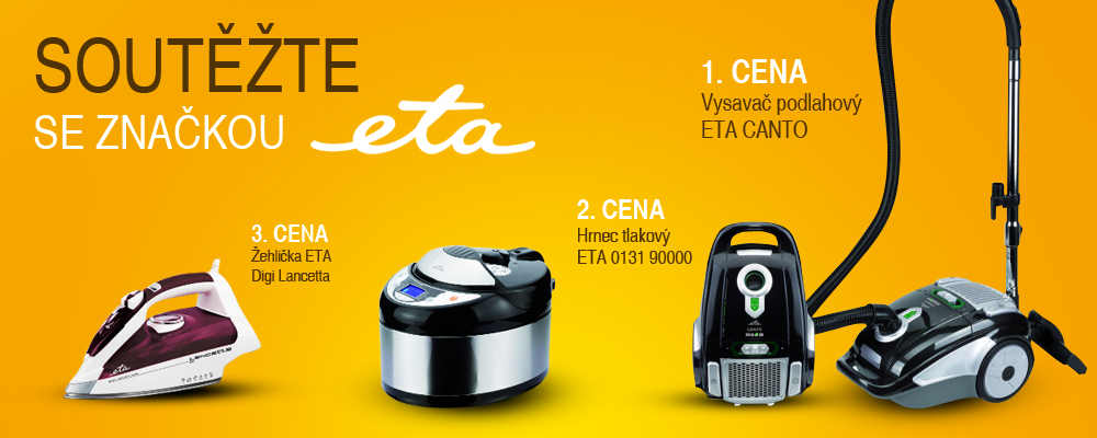 | Ceny: | 1. CENA - Vysavač podlahový ETA CANTO, 2. CENA - Hrnec tlakový ETA 0131 90000, 3. CENA - Žehlička ETA Digi Lancetta |