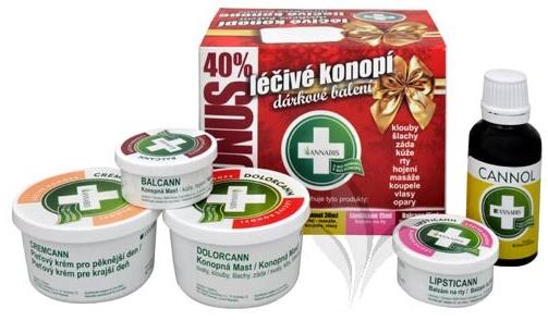 | Ceny: | Dárkové balení Léčivé konopí obsahuje Dolorcann na klouby, svaly, šlachy, záda, Cremcann na pleť a vrásky, Cannol na masáže, koupele a vlasy, Lipsticann na rty a Balcann na kůže a hojení. |