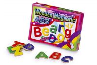 Padesát barevných písmenek ze dřeva opatřených magnetem.