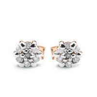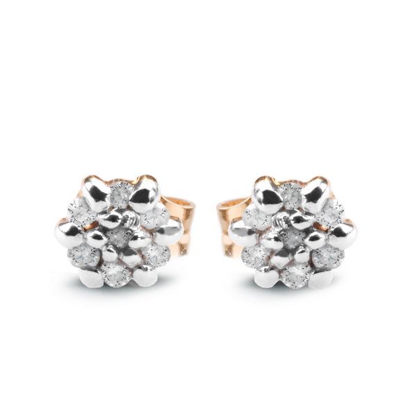 Zlaté naušnice s diamanty Au 0,585 se 14 Diamanty, váha diamantů 0,05 ct., barva I-L, ryzost I2-I3. Žluté a bílé zlato 0,585. Průměr naušnic 3,6 mm. Tloušťka 2,3 mm.
